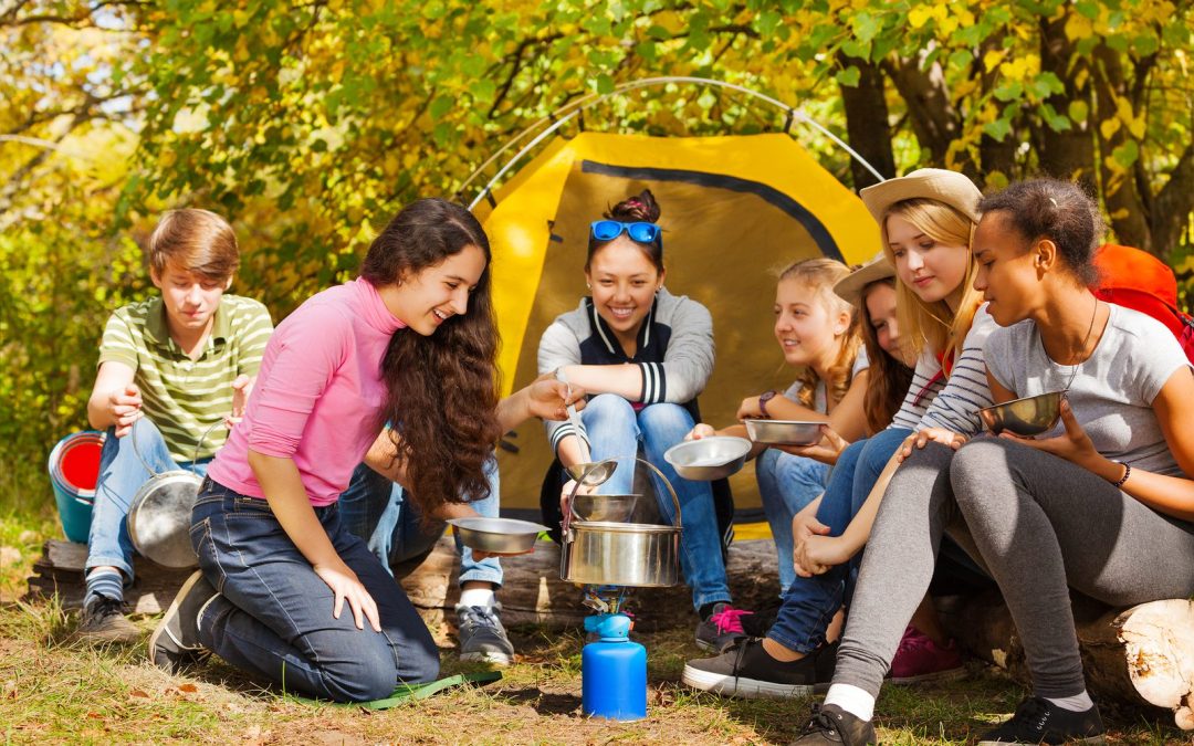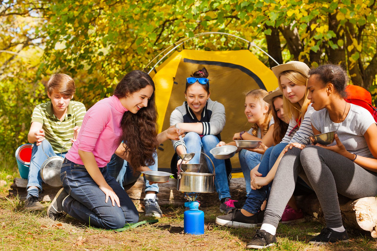 Teenagers cook soup in metallic pot near tent